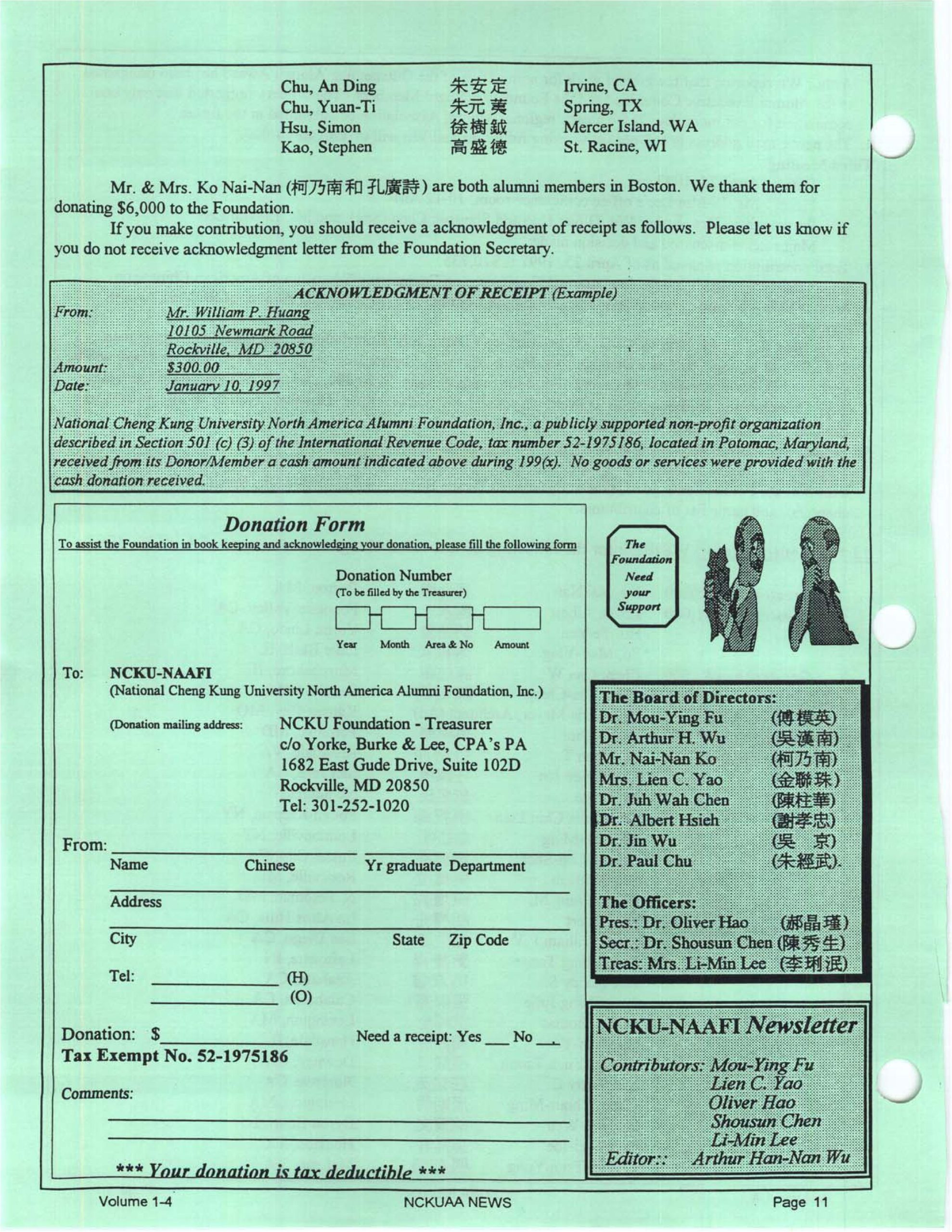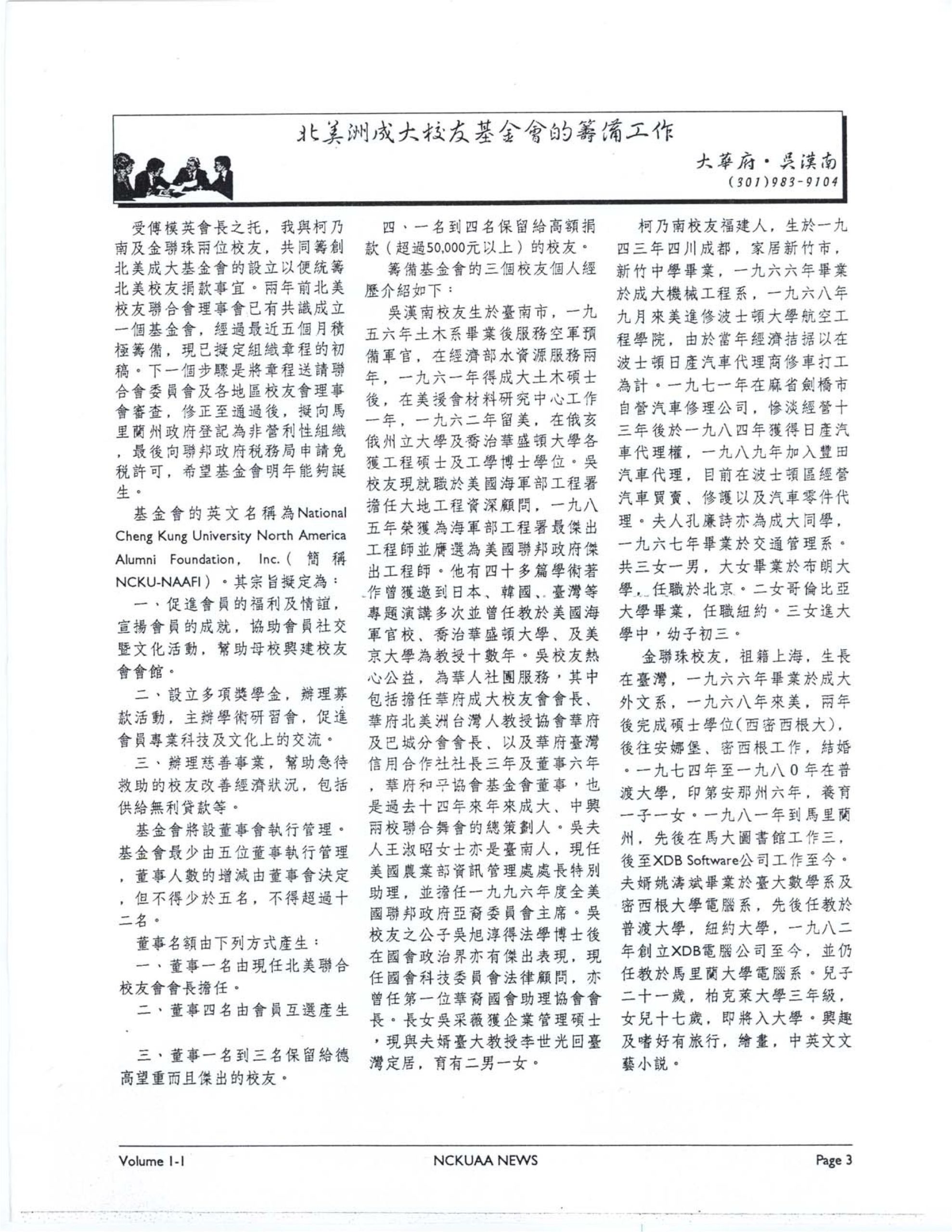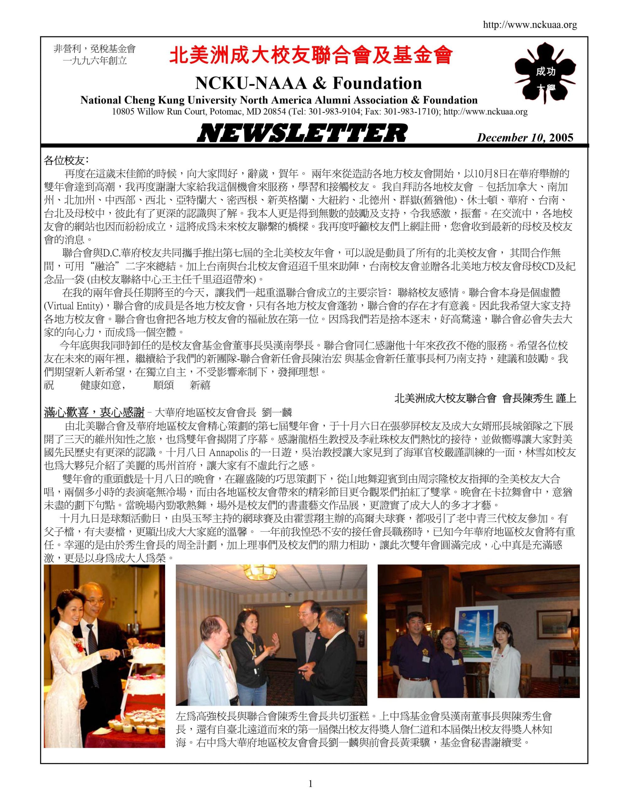 The Foundation was established in 1996 in Washington, D.C. by the joint efforts of dedicated NCKU alumni of North America. (The Foundation was established in 1996 by three alumni, H.N. Wu, N.N. Ko, and L.J. Kim, and was initiated in 1994 by alumnus Mouying Fu.) Its purpose is to:
