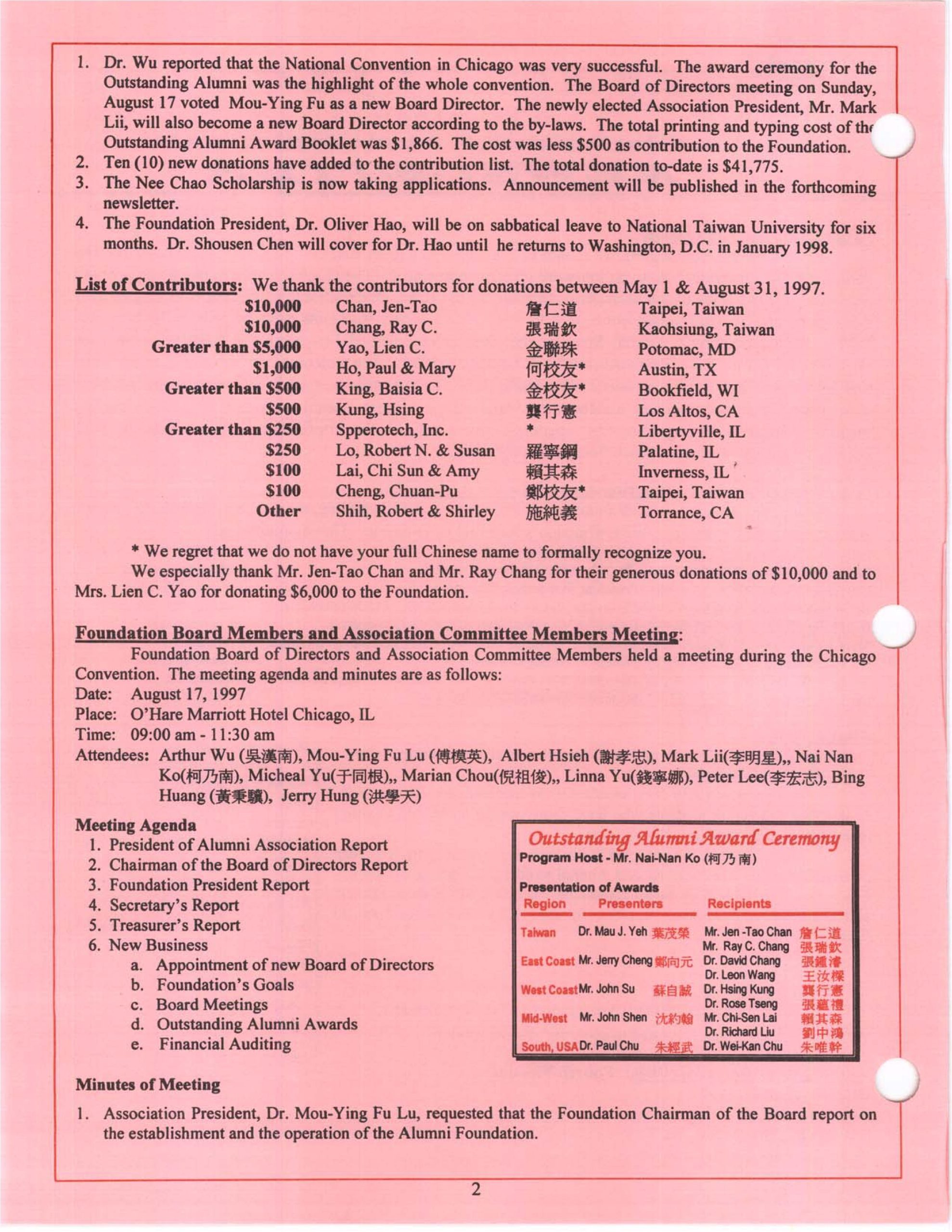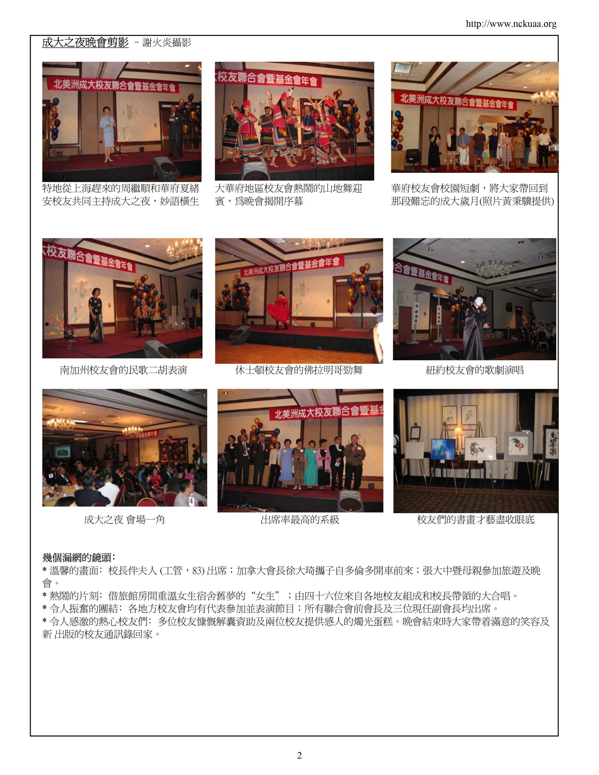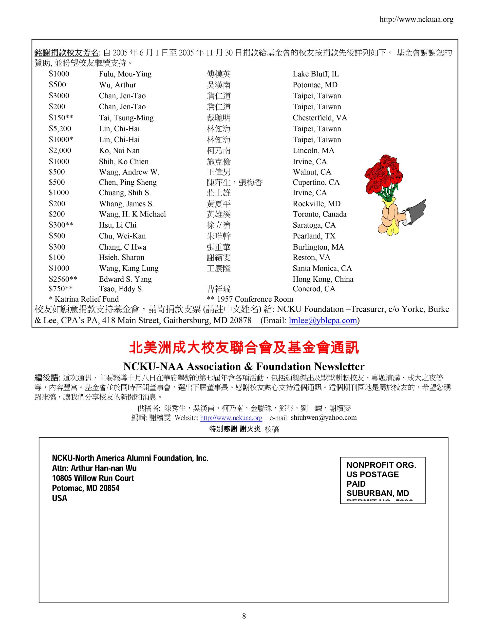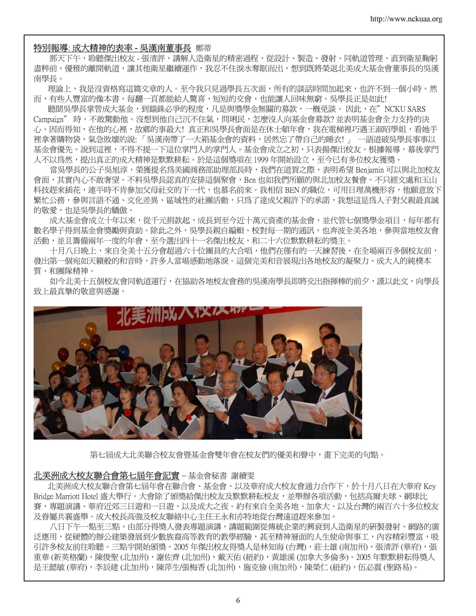 - Sponsor NCKU Alumni Association North America biennial meetings (since 1997) to increase alumni networking and promote interactive relationships between alumni and alma mater. At the meetings, awards are presented to outstanding alumni and hard-working alumni to encourage the core values of NCKU.