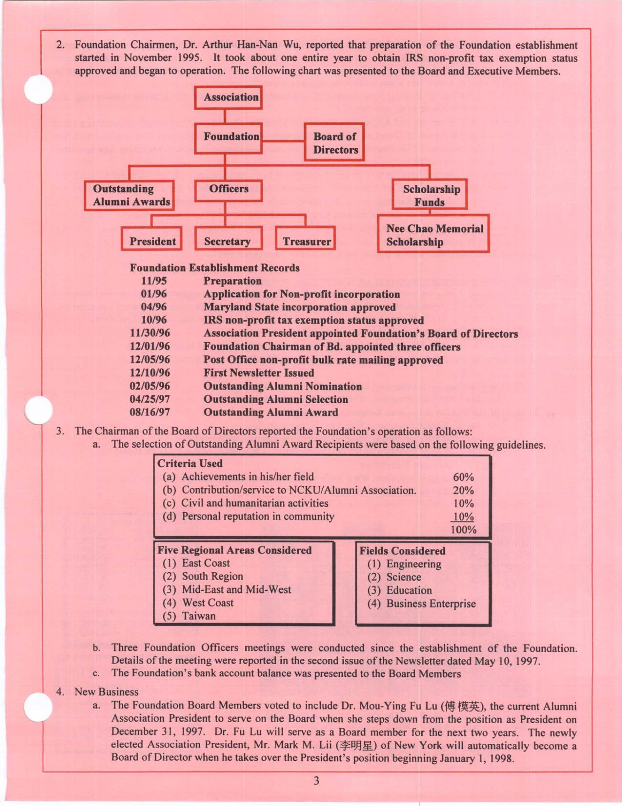 The Foundation has a Board of Directors that meets regularly to make decisions on important matters. A team of volunteers, including the Chairman, President, Secretary, and Treasurer, serve on the day-to-day affairs of the Foundation. The staff meets regularly to discuss business development. Since its establishment, the Foundation has recognized several outstanding alumni and alumni who have worked quietly, hosted many academic seminars, published regular newsletters and annual magazines, co-organized the North American Cheng Kung University Biennial Conference, supported alumni activities, developed and maintained the Foundation's website, set up a charitable fund to donate to alumni in need of assistance, and transferred scholarships, etc.